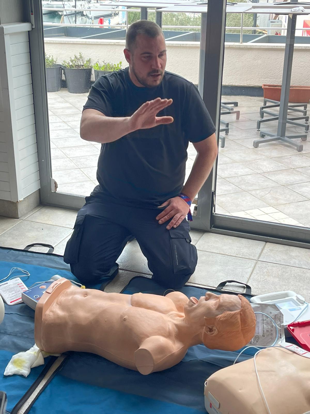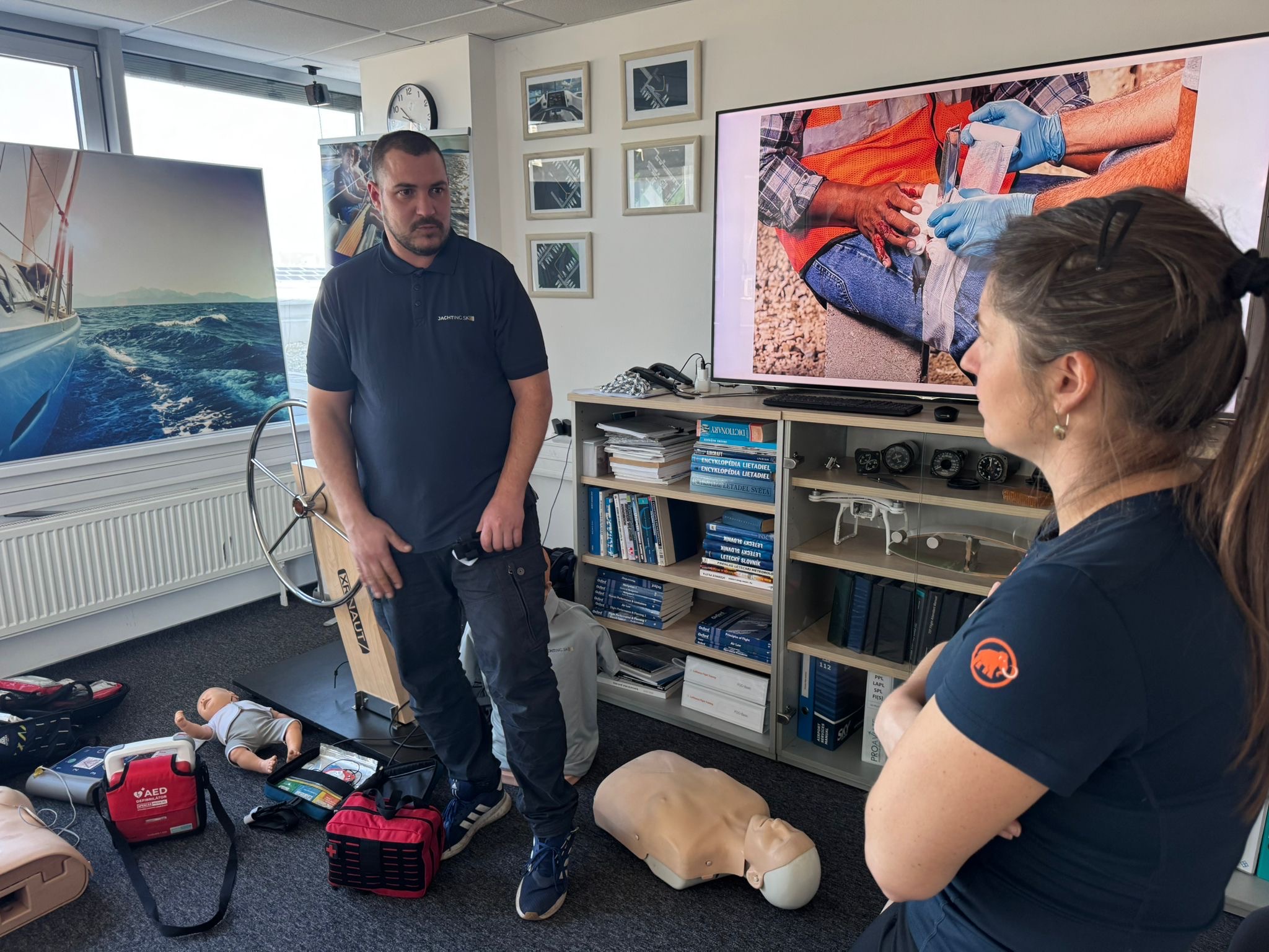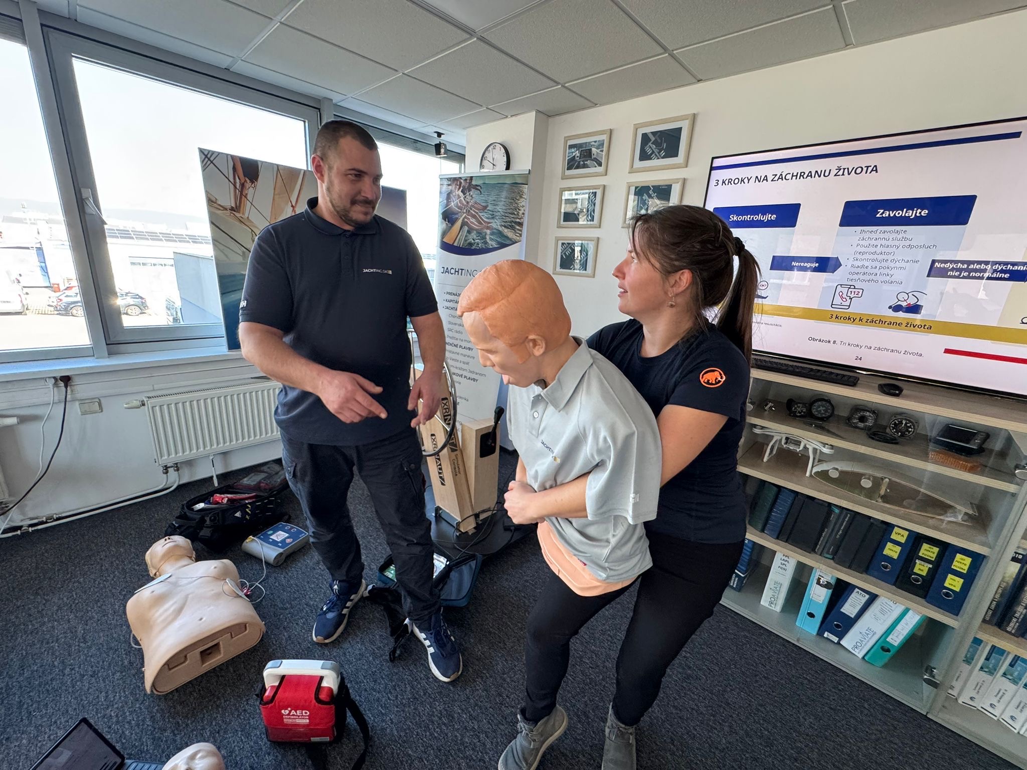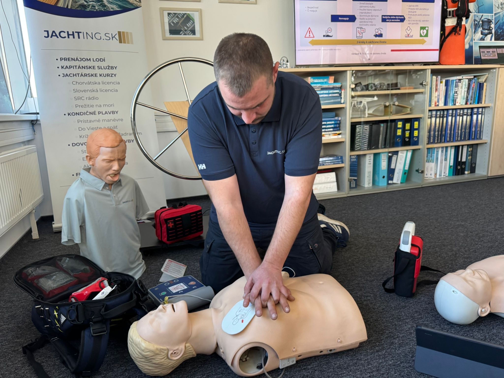 Cvičíme na figurínach, pracujeme s tréningovým AED a riešime situácie, ktoré sa môžu prihodiť priamo na vašej lodi. Žiadnu zbytočnú teóriu, len to, čo naozaj použijete.