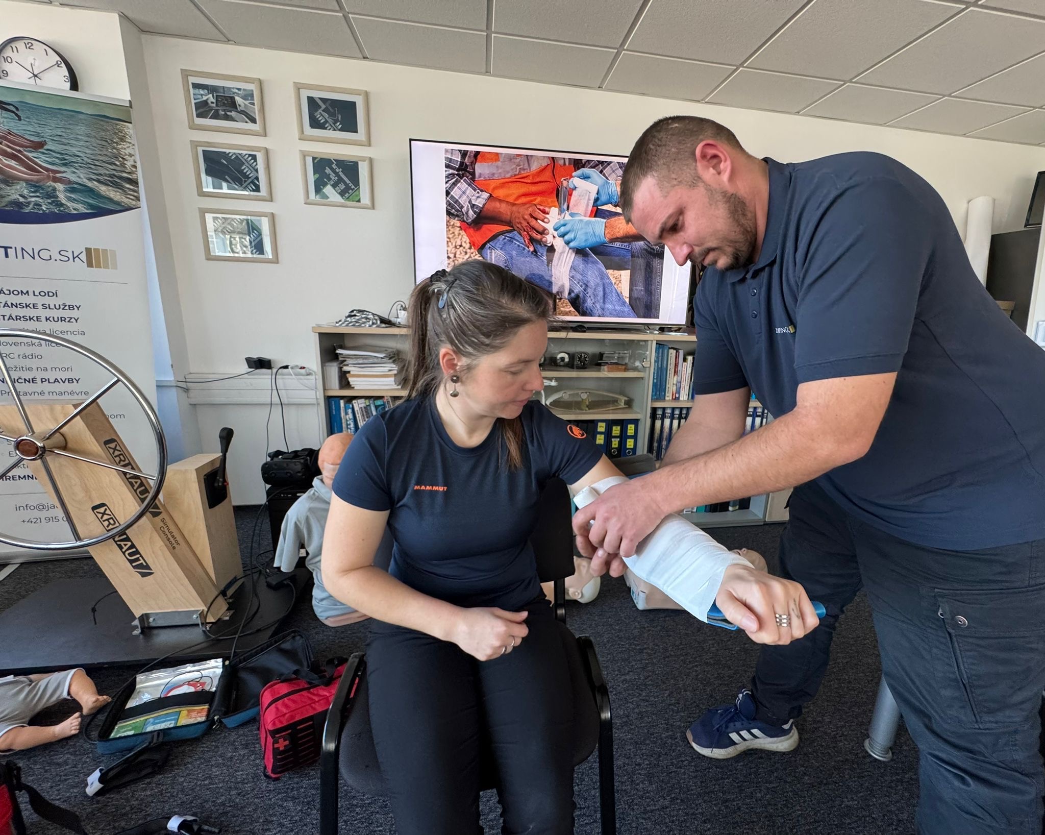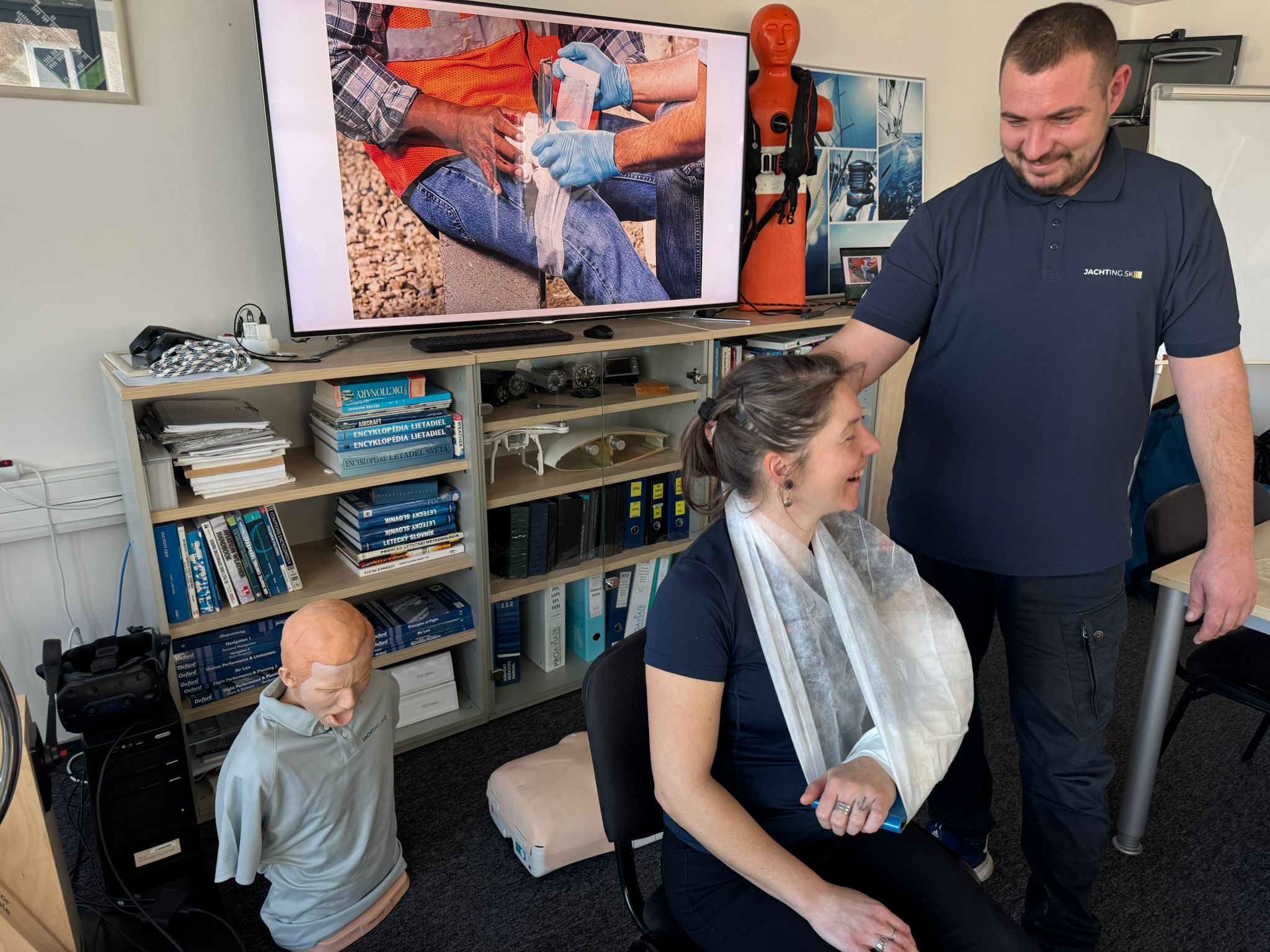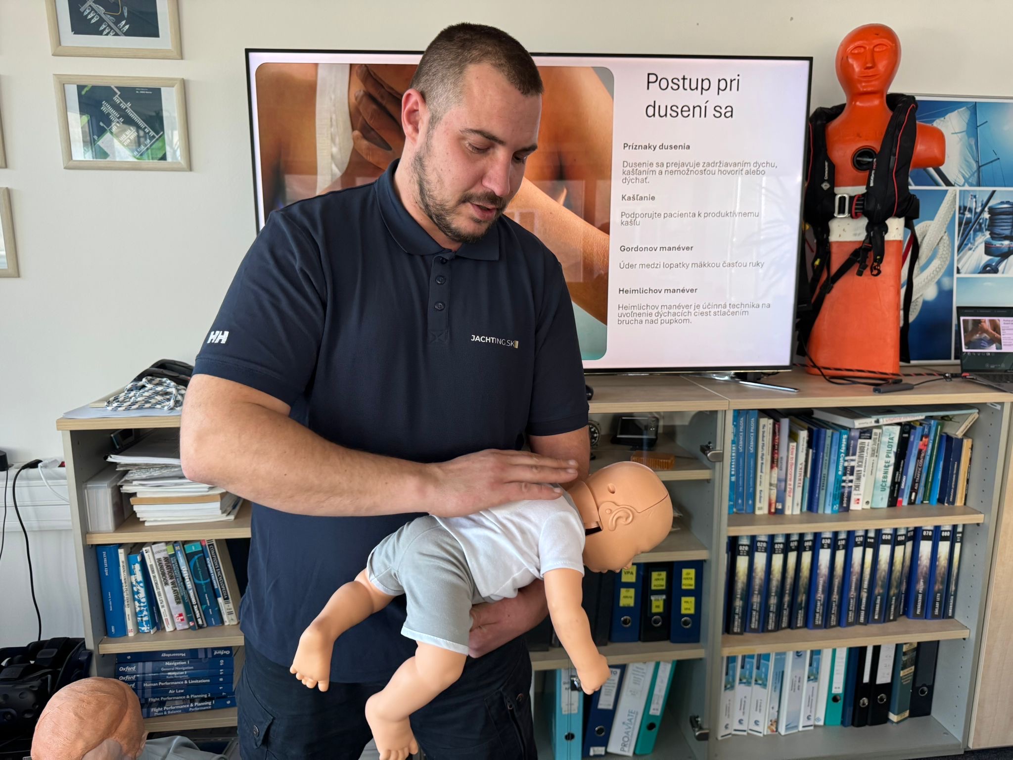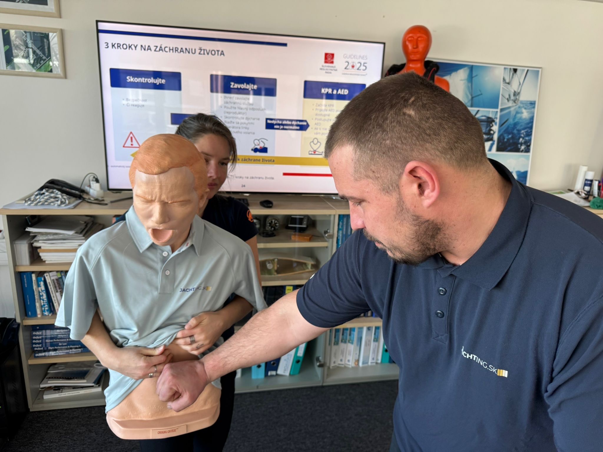 Cvičíme na figurínach, pracujeme s tréningovým AED a riešime situácie, ktoré sa môžu prihodiť priamo na vašej lodi. Žiadnu zbytočnú teóriu, len to, čo naozaj použijete.
